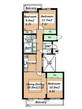3 BR・61.6 m²